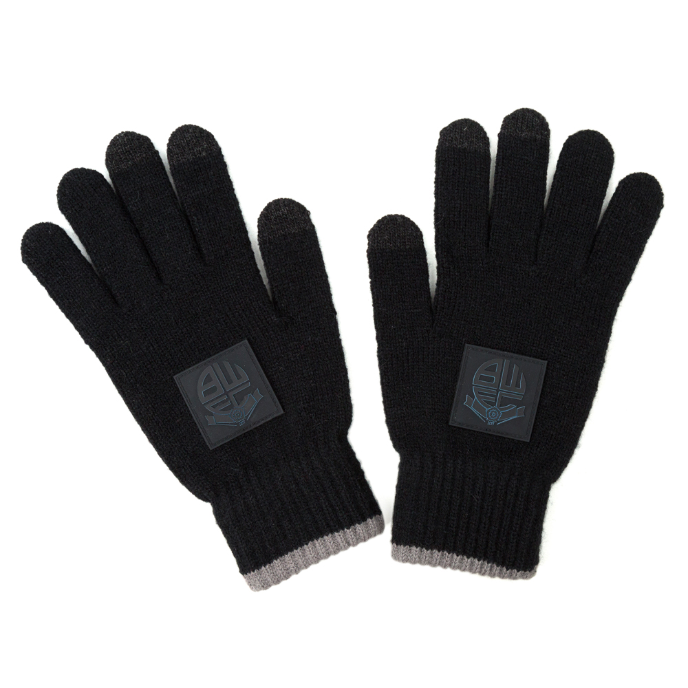Knitted black touch screen gloves with tonal crest.