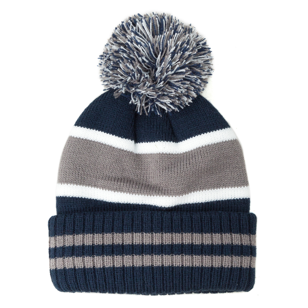 Navy, grey and white beanie with tonal crest.